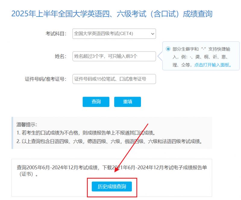 【导语】:可查询2005年6月-2024年12月考试成绩,下载2021年6月-2024年12月考试电子成绩报告单(证书)。