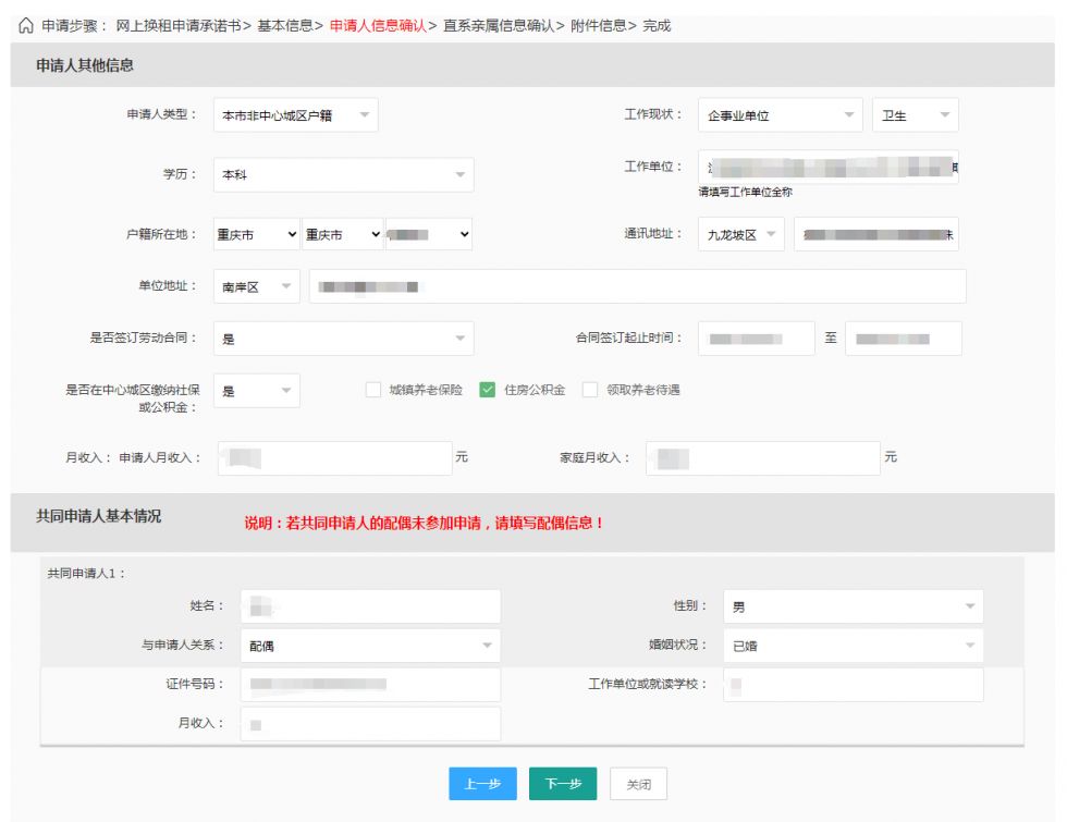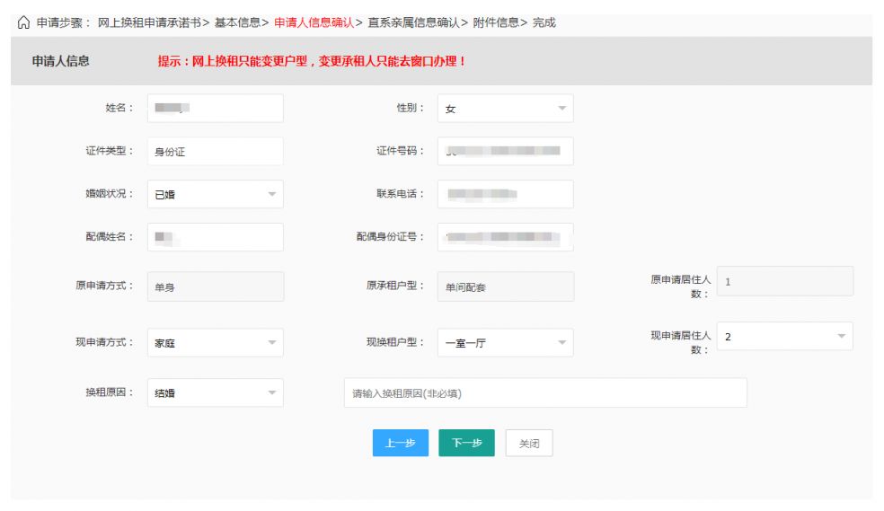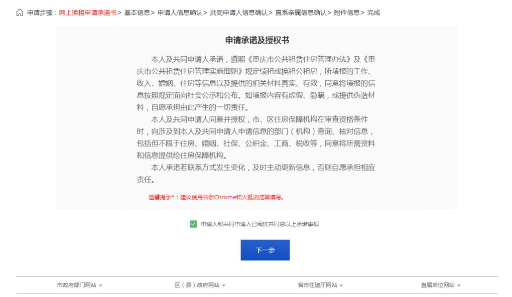 进入换租办理流程,认真阅读承诺书,并根据提示填写申请人、共同申请人等相关信息,点击【下一步】。