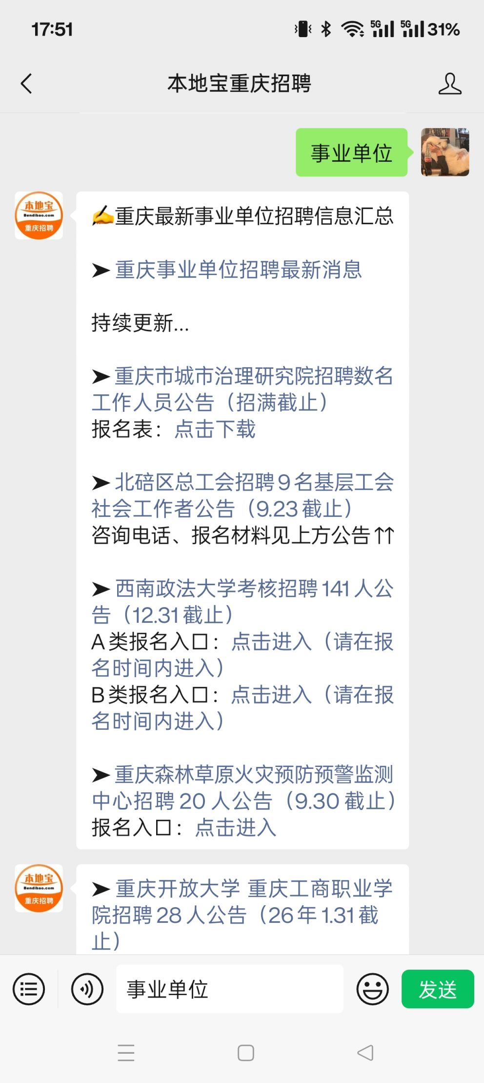 温馨提示:微信搜索并关注【本地宝重庆招聘】公众号,聊天对话框回复【事业单位】可获重庆最新事业单位招聘公告、招聘岗位、报名方式等信息。
