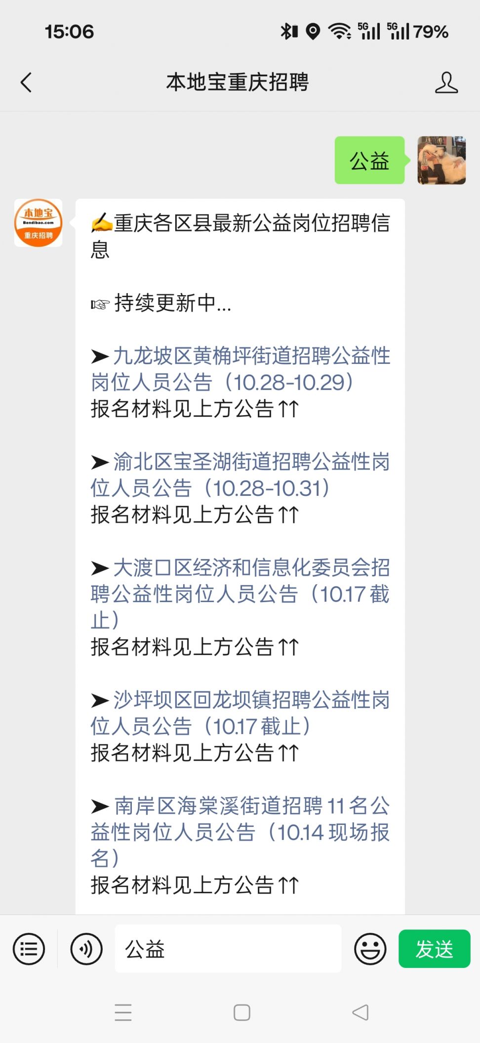 温馨提示:微信搜索并关注【本地宝重庆招聘】公众号,聊天对话框回复【公益】可获最新重庆公益岗位招聘公告、招聘岗位、报名方式等信息。