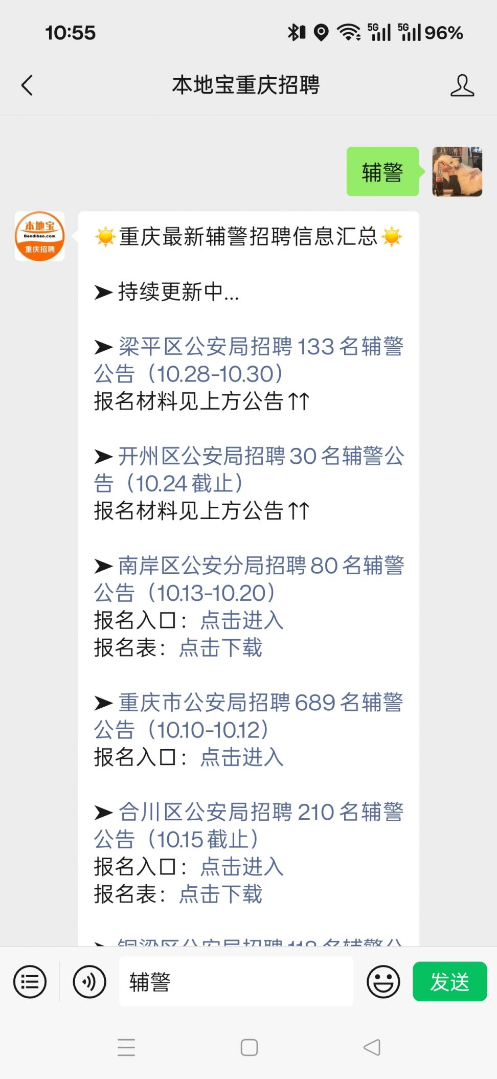 温馨提示:微信搜索并关注【本地宝重庆招聘】公众号,聊天对话框回复【辅警】可获最新公安局辅警招聘公告、招聘条件、招聘岗位、报名入口等相关信息。